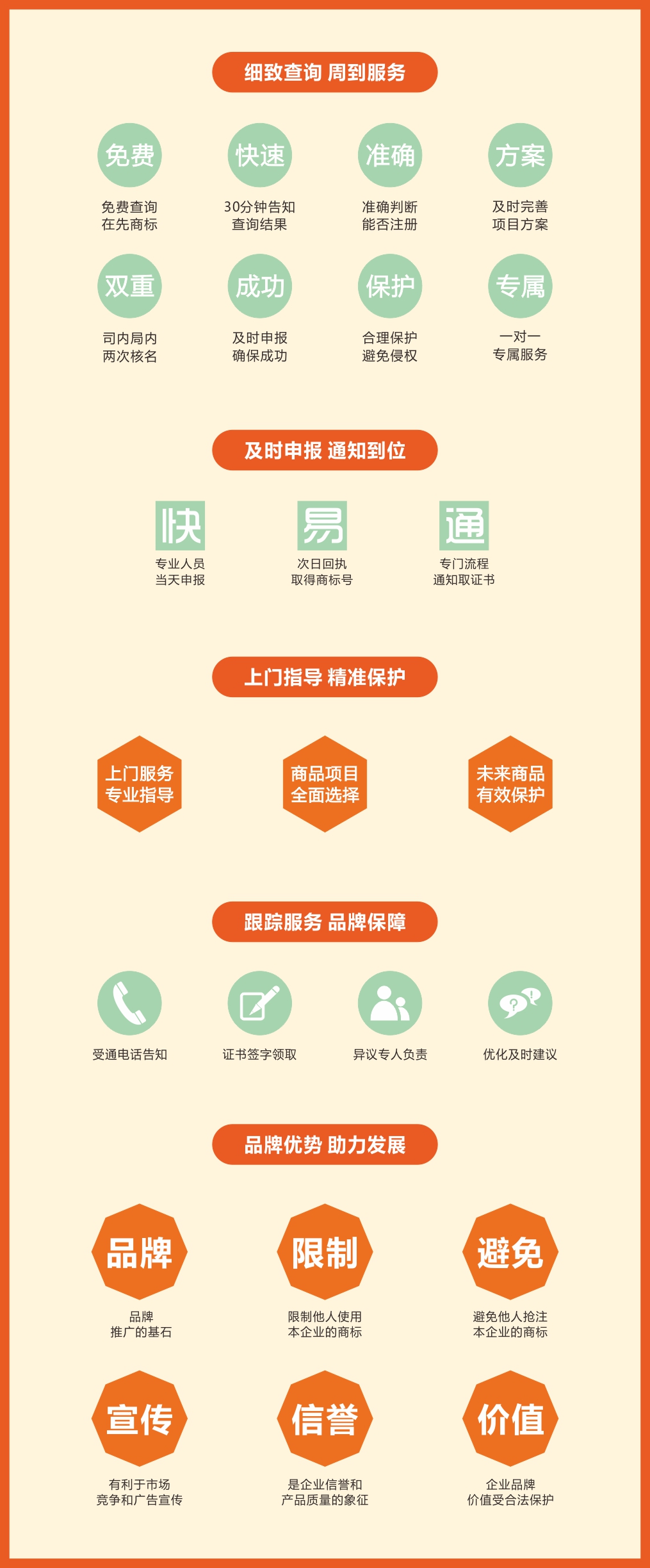 为国内申请人提供获得商标专用权的服务:包括近似商标查询;商标注册前分析;商标申报;受理通知书派发;商标注册证邮寄;商标全程节点通知;商标终身监测。